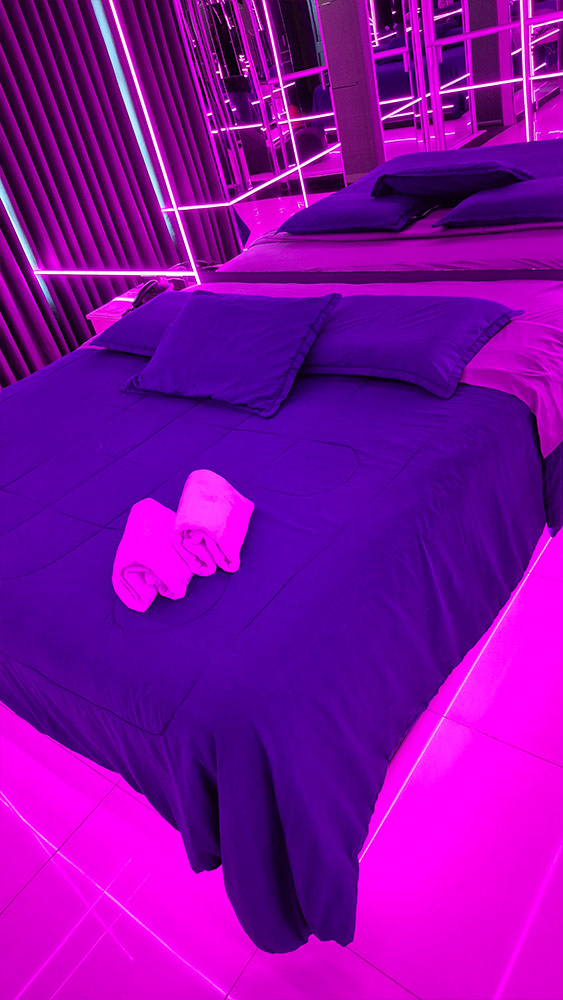 Déjate envolver por un ambiente vibrante, rodeado de espejos y luces neón que multiplican cada mirada, cada caricia, cada instante. Disfruta de la amplitud de una cama king size (2×2) que te invita a rendirte al deseo sin límites.